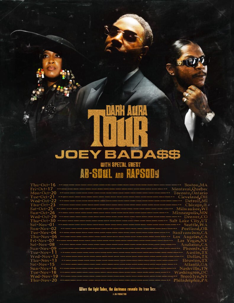 Brooklyn’s own Joey Bada$$ is set to bring his energy across North America this fall with the launch of the Dark Aura Tour, a run inspired by his newly released album Lonely at the Top. Joining him on stage will be hip-hop heavyweights Rapsody and Ab-Soul, making this tour a can’t-miss triple threat for rap fans.